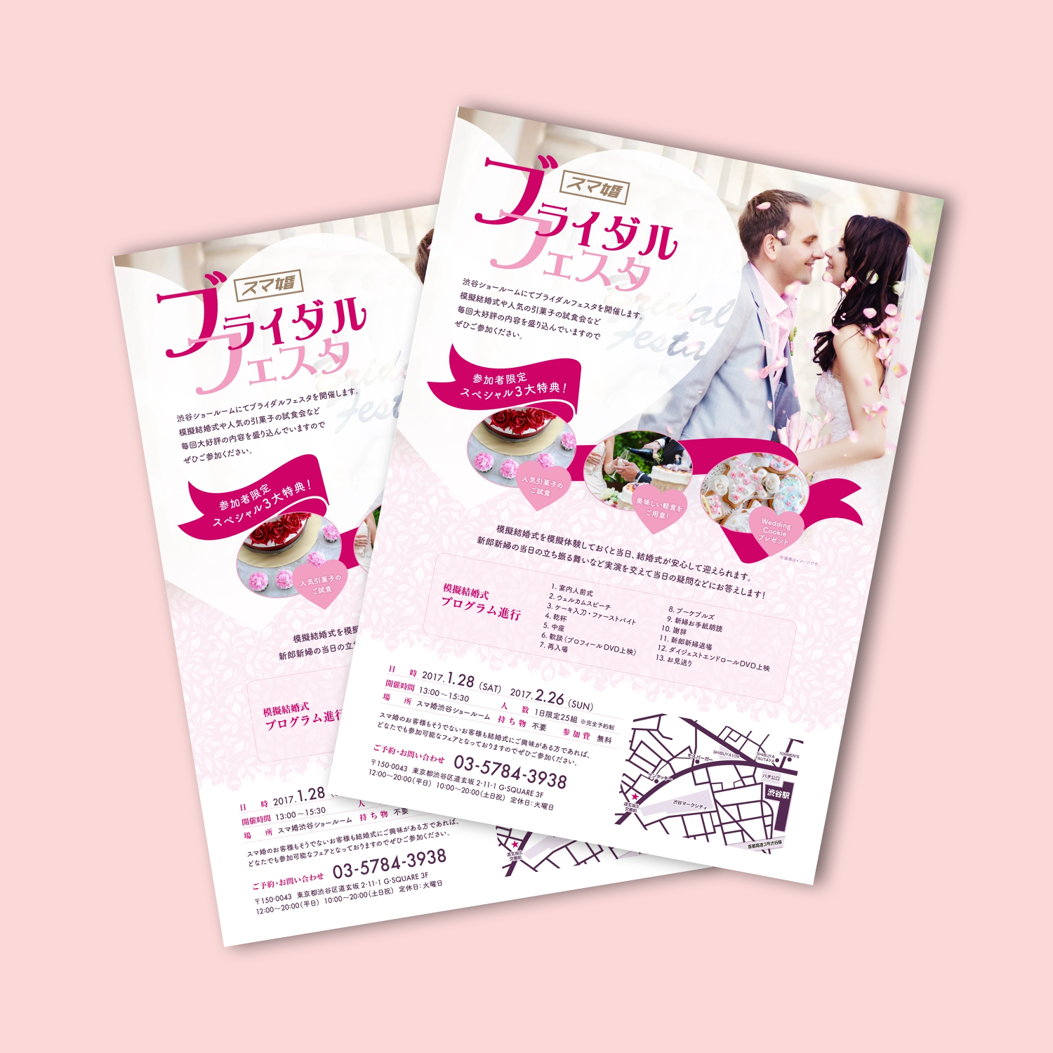 A4(片面)-Flyer-Design デザイン制作 MAP制作 ブライダルといった女性が最もときめくイベントを、ピンクいっぱいの華やかで可愛らしいデザインで制作しました。 Production / 2017 / mac Illustrator