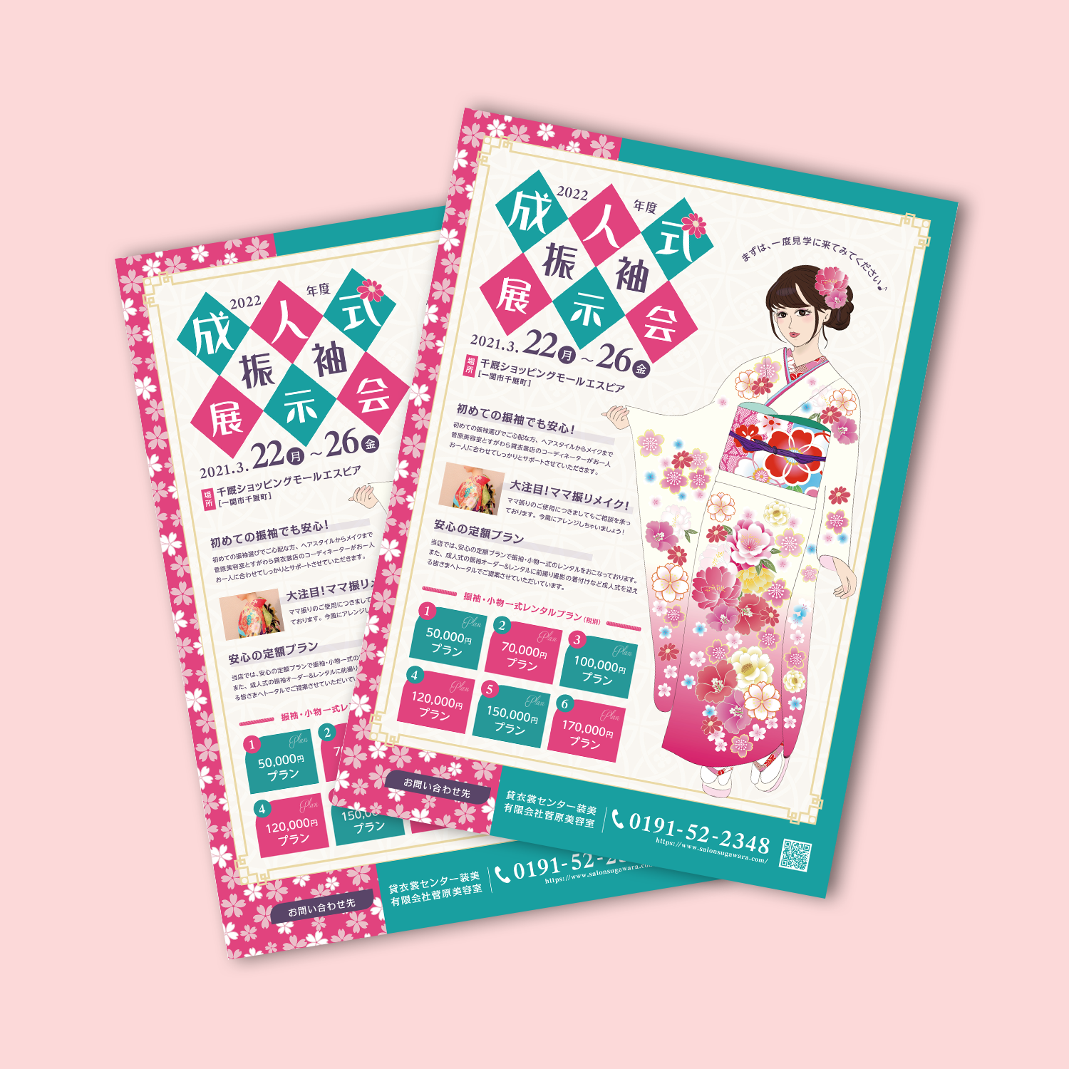 A4(片面)-Flyer-Design デザイン制作 イラスト作成 イラストから作成しました。イマドキ風の女の子の振袖を華やかに描いてみました。イラスト内のメイクにもこだわりました。 Production / 2021 / mac Illustrator